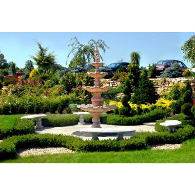 Einer der größeren Springbrunnen, der bei der Anordnung von Kreisverkehren in Parks / Gärten verwendet wird. Es schafft eine ideale Atmosphäre zum Entspannen, mit Bänken in der Nähe, von denen Sie auf das schnell fließende Wasser blicken und seinem Rauschen lauschen können. Ein Brunnen mit einer einfachen Form und einer vierstufigen Struktur. Angepasst für Arbeiten auf trockenem Boden und in einem Teich.