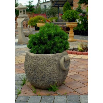 Gartentopf runder Krug 44 cm, mit Bügeln, die Griffe imitieren. Einfach elegant. Buchsbaumkugeln spielen perfekt darin.